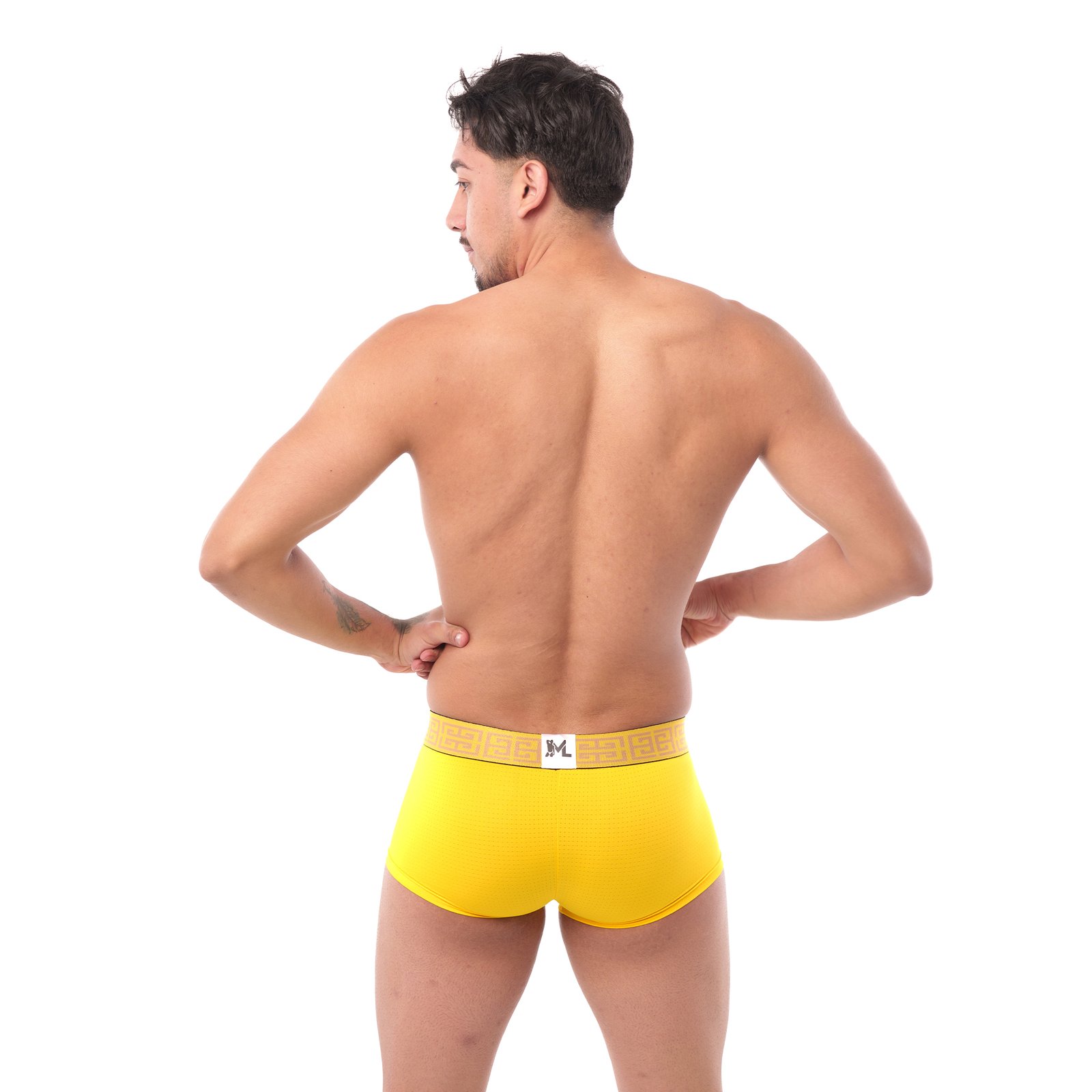 La energÃa masculina se viste de luz con este boxer premium pensado para hombres que saben destacar con estilo y seguridad. El amarillo transmite vitalidad y confianza, mientras el elástico con grecas doradas celebra la exclusividad de una edición limitada de aniversario. Una prenda que combina sensualidad moderna con comodidad superior, diseñada para quienes buscan marcar diferencia desde lo más Ãntimo.