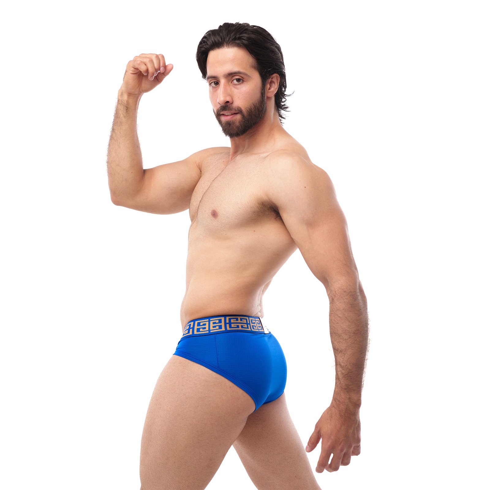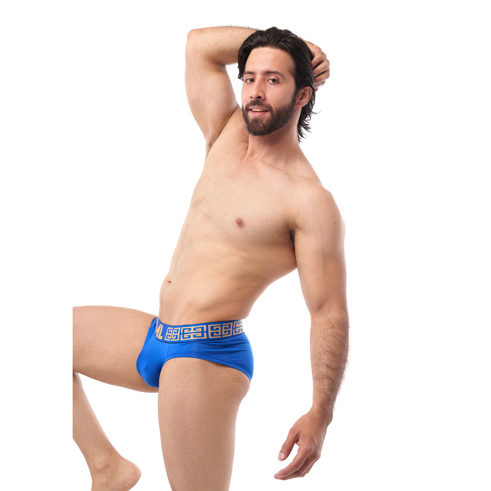 El poder de la elegancia masculina se refleja en este brief premium diseñado para hombres que saben combinar sensualidad y estilo. El azul rey transmite confianza y sofisticación, mientras el elástico con grecas doradas celebra la exclusividad de una edición limitada de aniversario. Una prenda que no solo se siente bien, sino que te hace sentir seguro, atractivo y único.